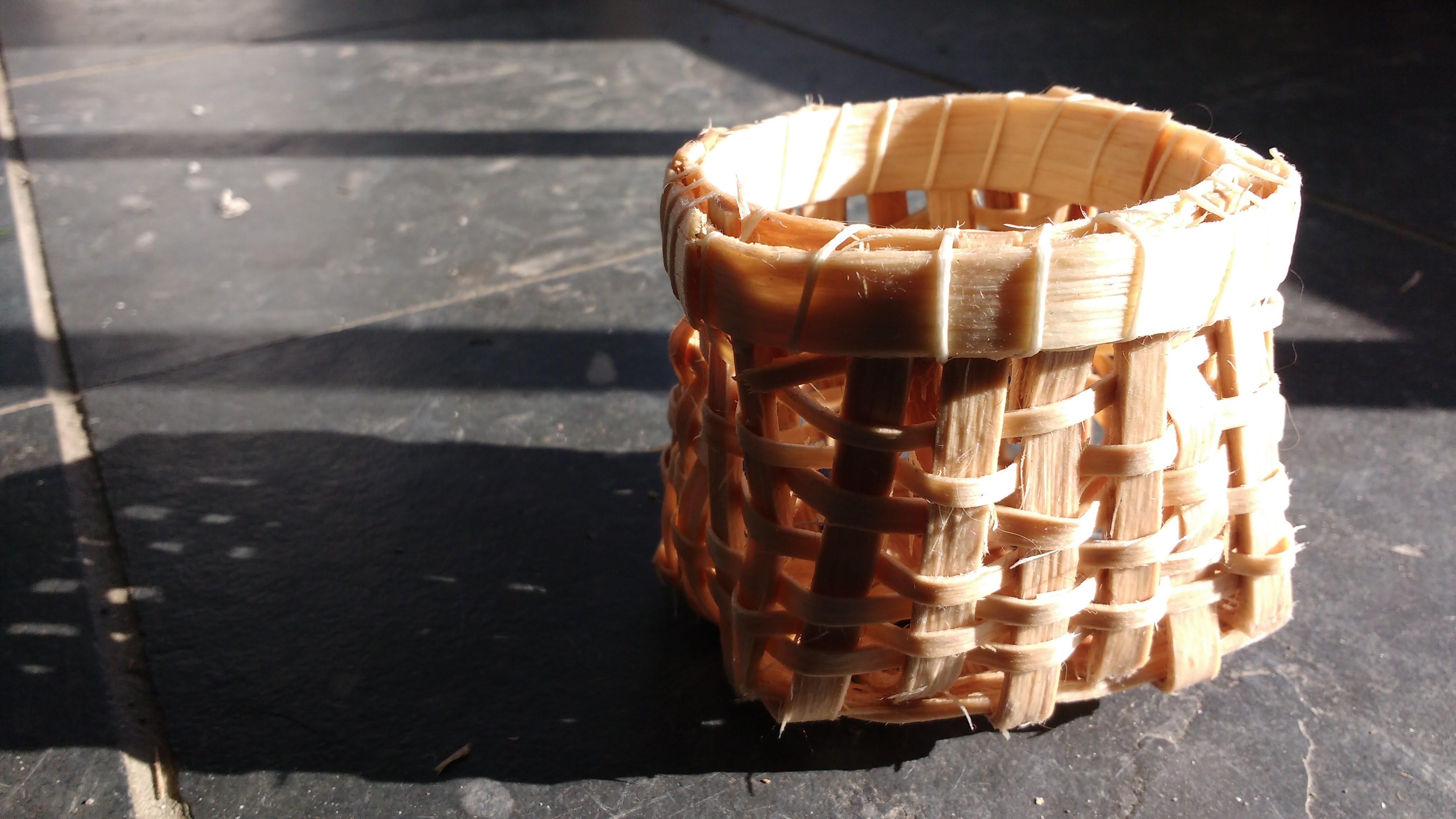 In the splitting process, I’m creating lots of little scraps that I carefully trim and coil up, because they may come in handy. Once I had a nice collection, I couldn’t resist making a tiny basket. I think its wonkiness is adorable, and the learning experience will help me when I make a larger basket. There were some challenges particular to making a tiny basket, such as not being able to fit my hand inside. During the harvest, I promised the trees that they would be remembered in song, photos, and baskets. I swear to you that I heard the tree exclaiming in mild outrage as I worked on this basket, “Seriously? This is how I’m going to be remembered??” Don’t worry, tree. There will be more baskets.